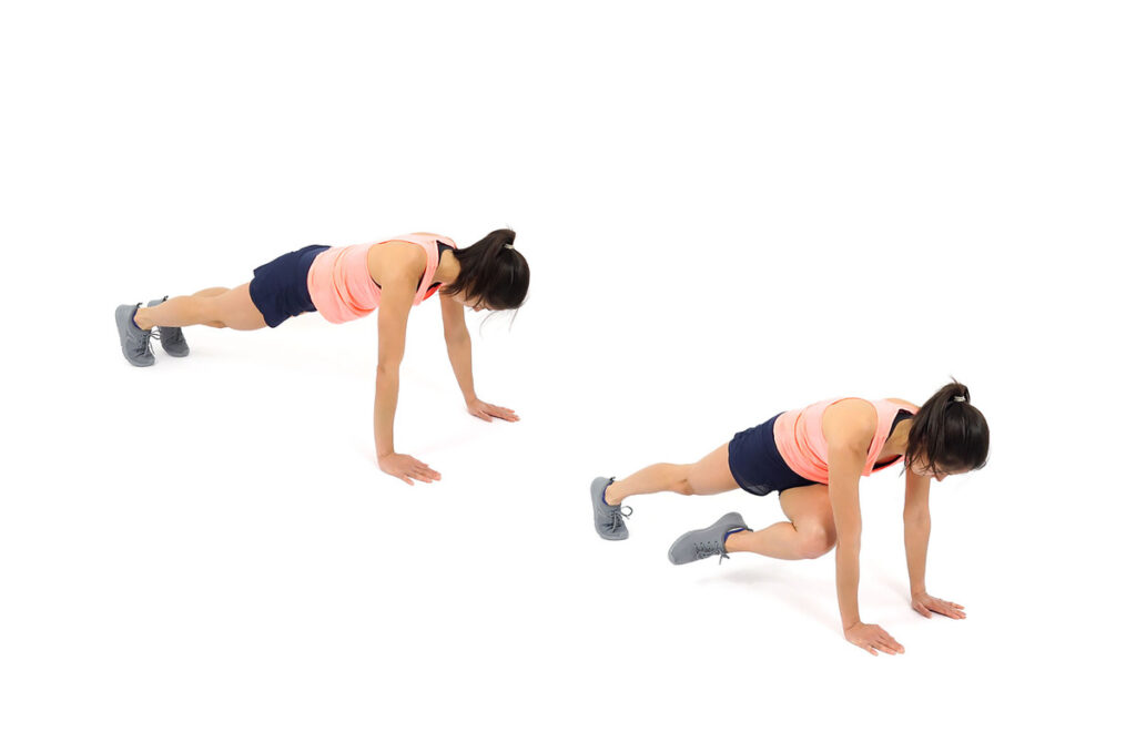 3. Keeping your hands firmly placed on the floor, contract your hip flexors and abdominal muscles to bring one knee in towards the opposing side of your chest, briefly planting your foot lightly on the floor below and taking great care not to knee yourself as you do so