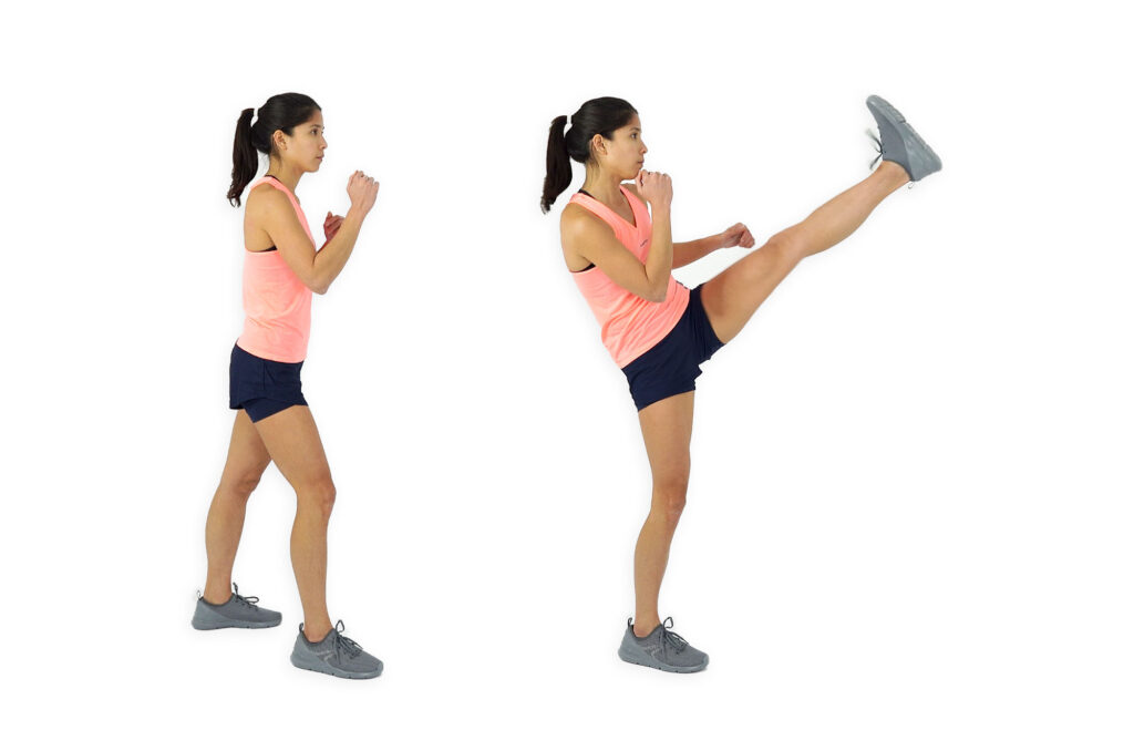 3. When the knee is elevated, snap a kick forward at an invisible target directly in front of you (the height of the kick is not important)