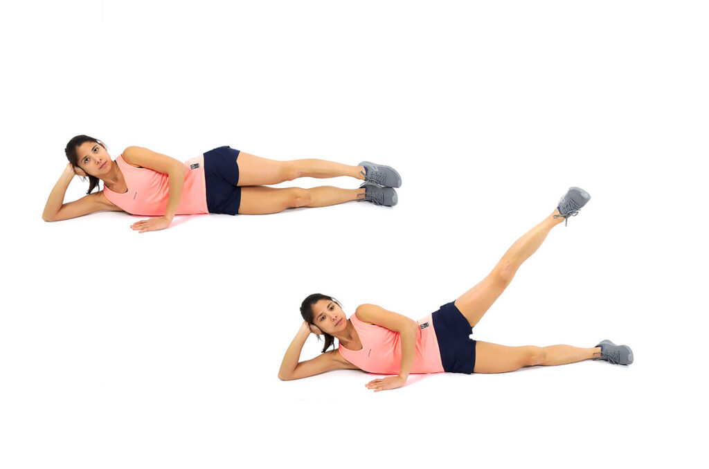 3. Using your outer thigh and glute muscles, raise the top leg up and away from your lower leg